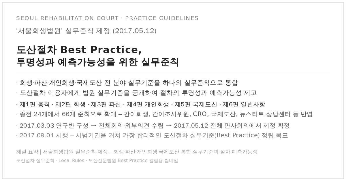 서울회생법원은 2017년 5월 12일, 회생·파산·개인회생·국제도산 전 분야를 아우르는 통합 실무준칙을 제정했다고 밝혔다. 이 글은 해당 보도자료를 바탕으로 실무준칙 제정의 취지와 주요 내용을 회생·파산 사건을 실무에서 다루어 온 강지훈 변호사의 시각에서 정리한 것이다.