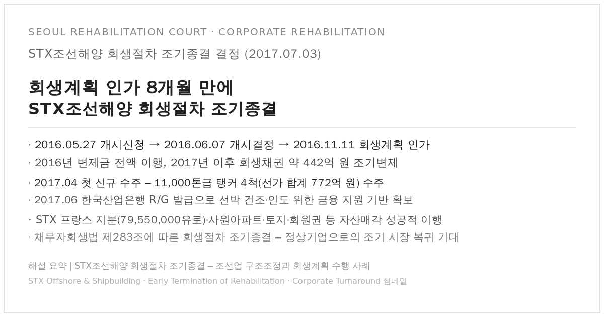 그래서 서울회생법원은 회생절차의 예측가능성을 높이고 회생에 적합한 채무자의 신속한 회복을 촉진하기 위해, “회생절차의 조기종결”에 관한 실무준칙을 마련해 운용해 오고 있다. STX조선해양 사건은 이러한 조기종결 원칙이 실제로 어떻게 적용되는지 잘 보여주는 사례다.