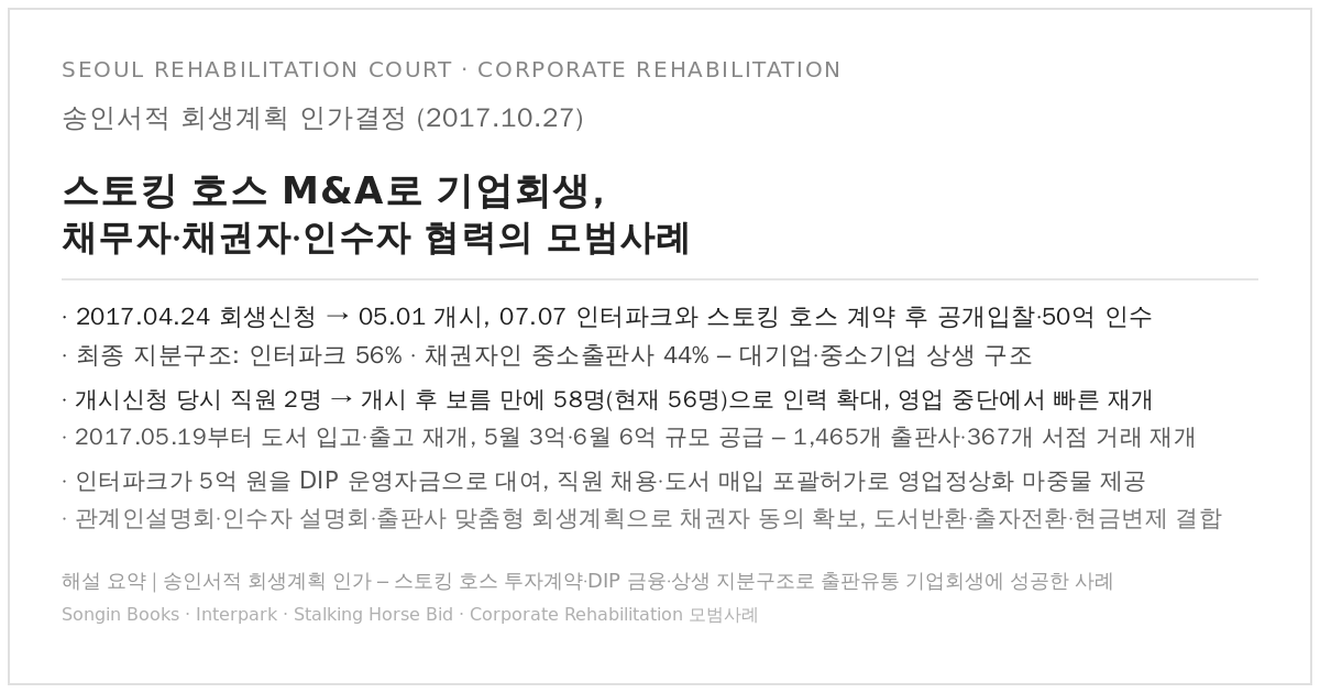 송인서적은 2017년 4월 24일 회생절차 개시를 신청하여 5월 1일 회생절차가 개시되었습니다. 이후 2017년 7월 7일, 인수의향자인 인터파크와 사이에 스토킹 호스 비드(Stalking Horse Bid) 투자계약을 체결한 뒤 M&A 공개입찰 절차를 거쳐, 최종적으로 인터파크가 50억 원에 송인서적을 인수하게 되었습니다.