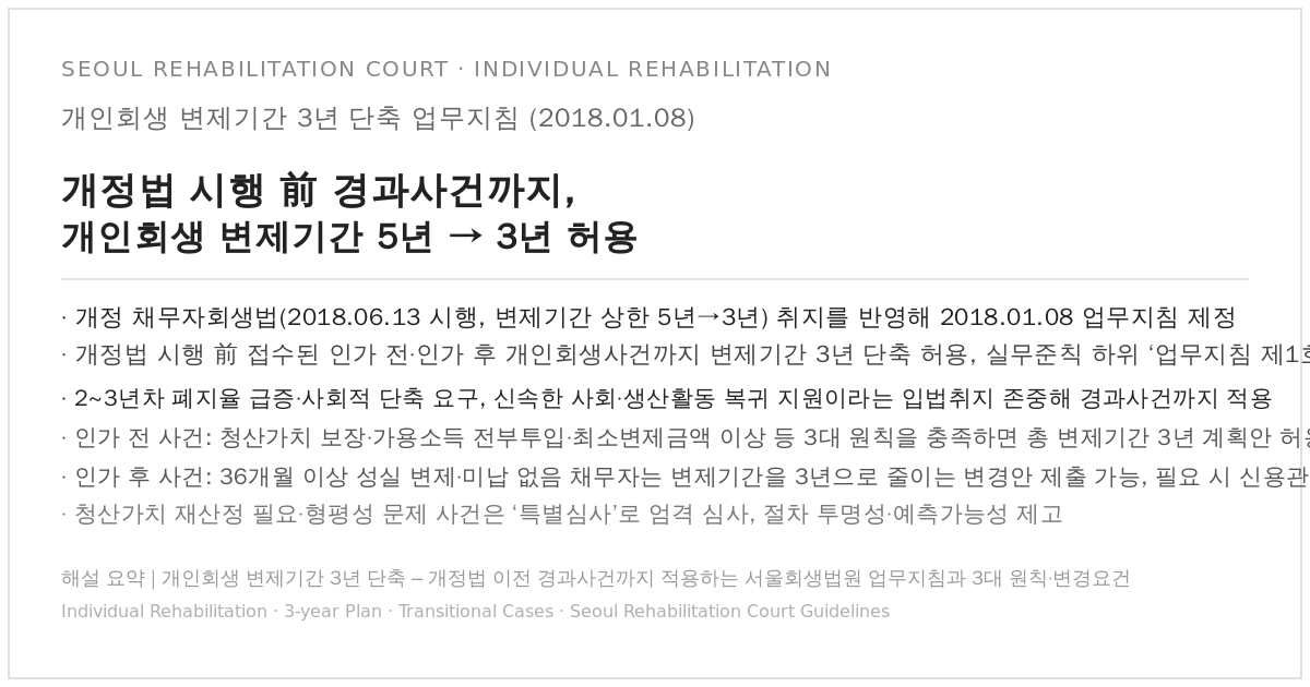 서울회생법원은 이 입법 취지를 선제적으로 반영하여, 개정법 시행일 이전에 접수된 개인회생사건(인가 전·인가 후 사건 모두)에 대하여도 일정 요건을 갖춘 경우 변제기간을 3년으로 단축할 수 있도록 업무지침 제1호(2018. 1. 8. 시행)를 제정했습니다.