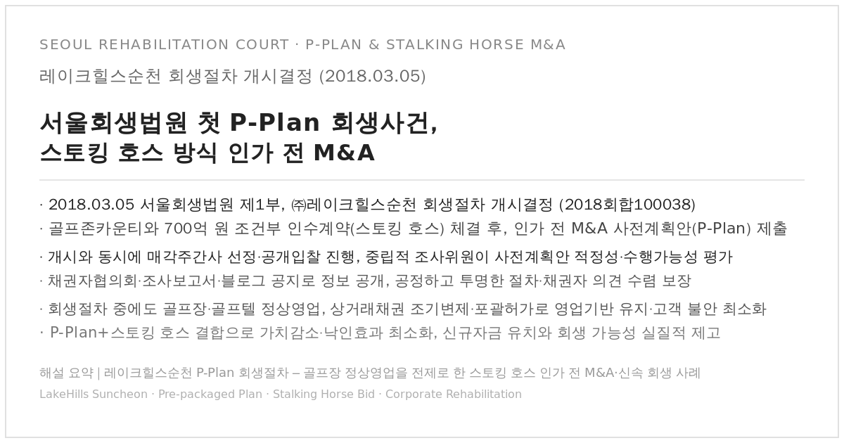 채무자인 레이크힐스순천은 ㈜골프존카운티와 약 700억 원 규모의 조건부 인수계약 (스토킹 호스 계약)을 체결하고, 채권자 과반수의 동의를 받아 인가 전 M&A를 내용으로 하는 사전계획안(P-Plan)을 작성한 뒤, 이를 회생개시신청과 동시에 제출했습니다.