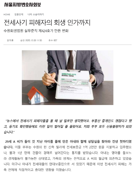 ※ 서울지방변호사회 회보에 게재된 「전세사기 피해자의 회생 인가까지」 글의 일부 화면입니다.