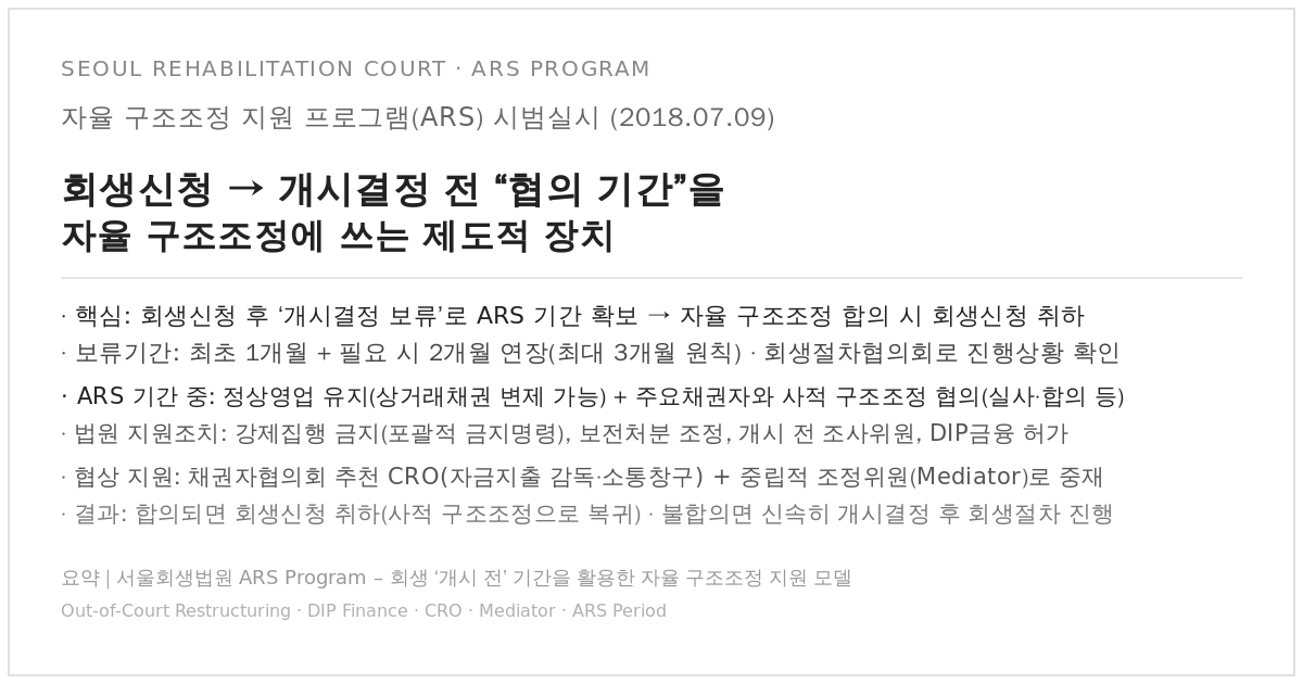 ARS 프로그램은 회생절차의 장점(강제집행 통제, 다수결 원칙 등)은 살리되, 회생절차가 가져올 수 있는 영업 제약을 완화하기 위해 개시결정 전의 시간을 협상과 조정의 장으로 공식화한 시도입니다.