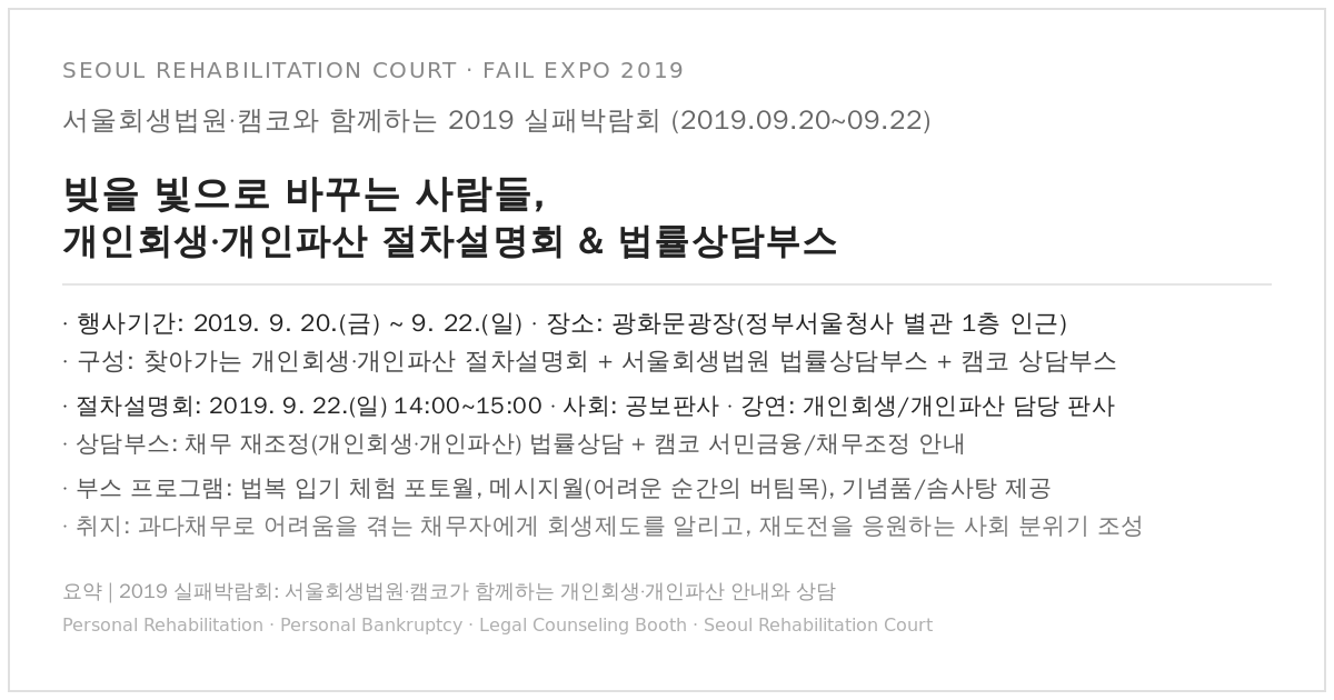 서울회생법원은 2019년 실패박람회(모토: “실패를 넘어 도전으로”)에 한국자산관리공사(캠코)와 공동 후원기관으로 참여하여, 과다채무로 어려움을 겪는 시민에게 개인회생·개인파산 제도를 알리고 절차설명회와 법률상담부스를 운영한다고 안내했습니다. 이 글은 해당 안내자료의 핵심만 정리한 것이며, 회생·파산 실무를 다루어 온 강지훈 변호사의 시각에서 행사 구성과 일정이 한눈에 보이도록 정리했습니다.